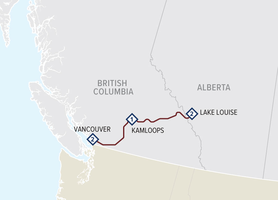 Departing early in the morning, travel onboard Rocky Mountaineer from the mountain resort town of Banff to Kamloops, in the heart of the British Columbia Interior. Your journey takes you through ever-changing scenery as you travel between the iconic glacier and snow-capped peaks of the Canadian Rockies over mountain passes and through remarkable tunnels, along rocky lakeshores and across the ranchlands of the Interior. Today's highlights include the Continental Divide, the Spiral Tunnels, Kicking Horse Canyon, Rogers Pass and Craigellachie, where the last spike of the Canadian Pacific Railway was driven. You will arrive in Kamloops in the evening. Overnight in Kamloops. B, L.